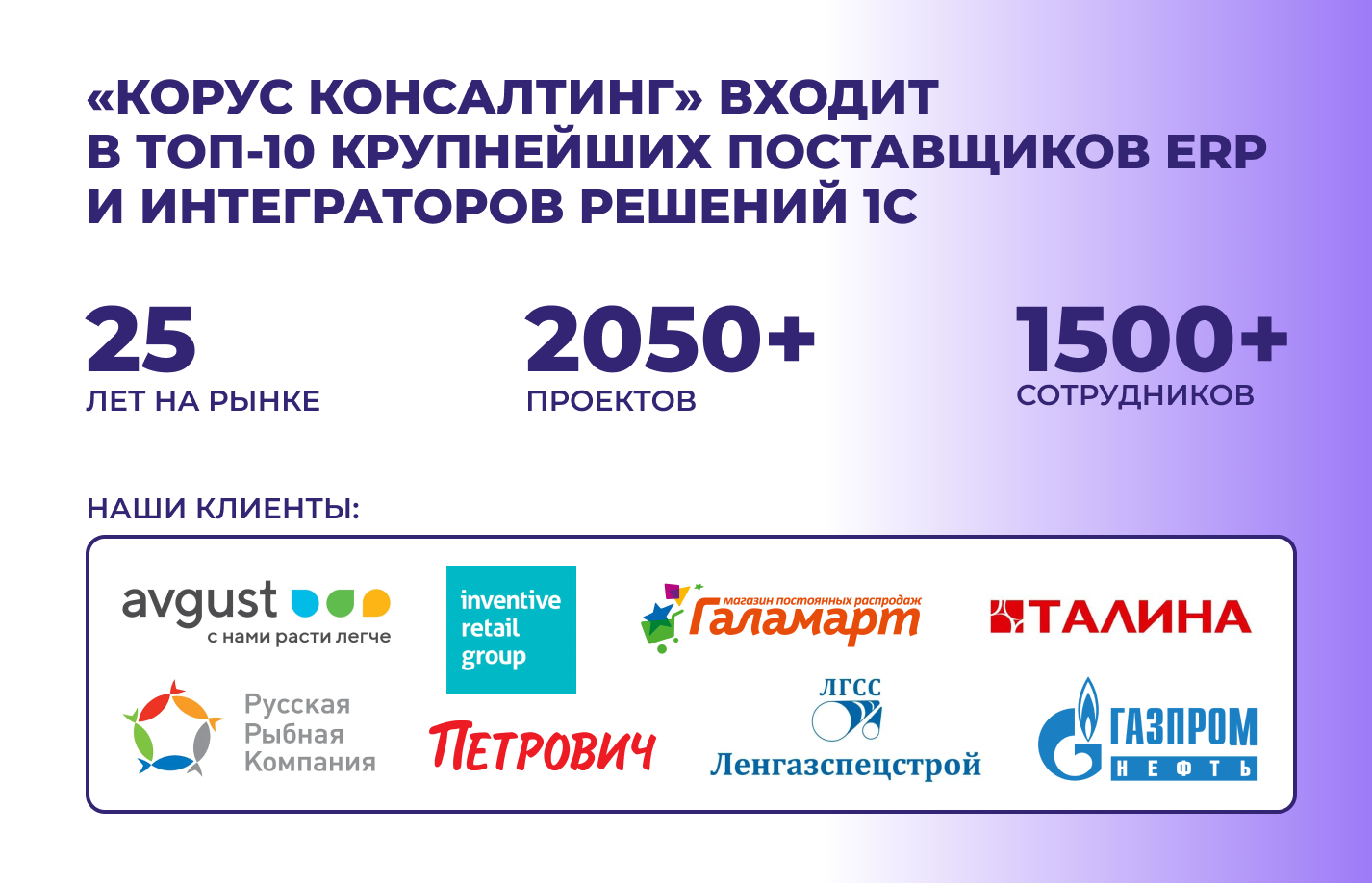 Более 15 лет опыта проектирования ERP-решений для крупного бизнеса на базе 1С, SAP и Microsoft. Специализируется на снижении проектных рисков. | | | | | | | «КОРУС Консалтинг» — российская ИТ-компания, предоставляющая услуги по ИТ-консалтингу, оптимизации и автоматизации бизнес-процессов. С 2000 года реализовано более 2050 проектов во всех отраслях экономики. Входит в топ-10 крупнейших интеграторов решений 1С по версии TAdviser.