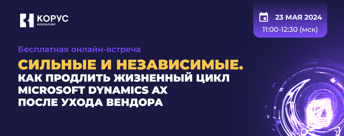| [Бесплатная онлайн-встреча] «Сильные и независимые. Как продлить жизненный цикл Microsoft Dynamics AX после ухода вендора», 23.05.2024 | | | | Бесплатная онлайн-встреча «КОРУС Консалтинг» 23 мая 11:00-12:30 (мск) Как обеспечить работоспособность ERP? Снизить риски использования и автоматизировать новые требования бизнеса? Эти вопросы важно решить компаниям, которые работают на Microsoft Dynamics AX.