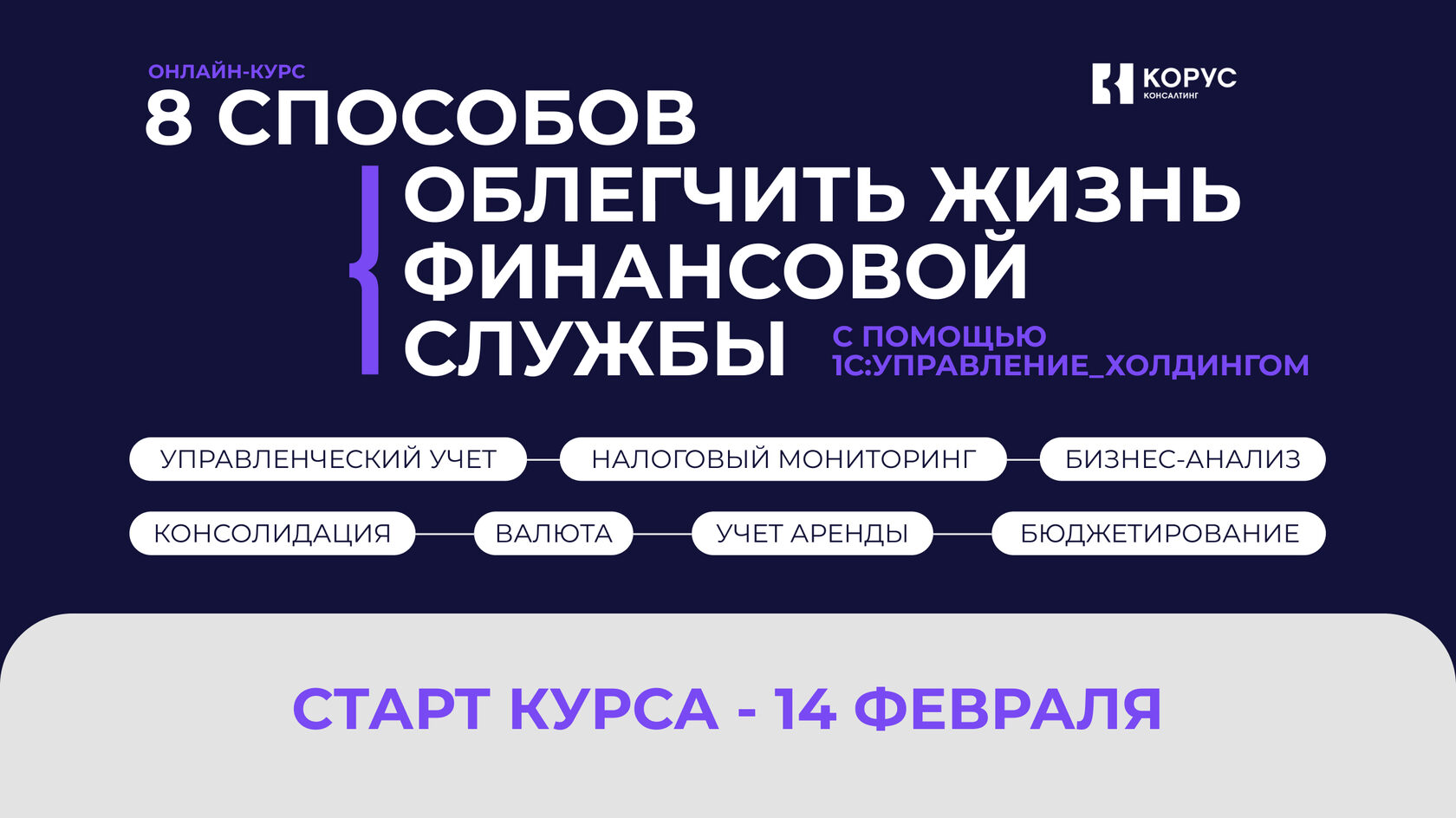 | Открыта запись на бесплатный онлайн-курс для финансовых директоров «8 способов облегчить жизнь финансовой службы». Старт 14 февраля | | | | 14 февраля запускаем онлайн-курс, где эксперты «КОРУС Консалтинг» расскажут о возможностях системы «1С:Управление холдингом» | | | | Мы приглашаем финансовых директоров, руководителей отделов РСБУ и МСФО и всех сотрудников, ответственных за автоматизацию финансовой функции. | | | | | ВИТРИНА ДАННЫХ ДЛЯ НАЛОГОВОГО МОНИТОРИНГА | | Все как на ладони: обзор типовой реализации в системе и примеры проектов. | | | | ФСБУ 25/2018: УЧЕТ АРЕНДЫ В 1С:УХ | | Обзор возможностей 1С:УХ. Как добиться легкости отражения операций. | | | | ЭФФЕКТИВНАЯ ОРГАНИЗАЦИЯ БЮДЖЕТИРОВАНИЯ | | Сложности организации бюджетного процесса и как правильно подготовиться к автоматизации. | | | | БИЗНЕС-АНАЛИЗ В 1С:УХ | | Отчеты, варианты настроек и подачи информации. | | | | УПРАВЛЕНЧЕСКИЙ УЧЕТ НА БАЗЕ МСФО | | Сблизить можно все! Как уйти от параллельного ведения учетов и ускорить подготовку отчетности. | | | | ТРАНСФОРМАЦИОННАЯ ИЛИ ТРАНЗАКЦИОННАЯ МОДЕЛЬ? | | Как выбрать правильный формат? 1С:УХ поддерживает оба варианта, а также различные симбиозы. | | | | КОНСОЛИДАЦИЯ. ПОДВОДНЫЕ КАМНИ И КАК ИХ ОБХОДИТЬ | | Типовые возможности 1С:УХ и лайфхаки с проектов. | | | | ВАЛЮТА В КОНСОЛИДИРОВАННОЙ ОТЧЕТНОСТИ | | Консолидируем отчетность подразделений из разных юрисдикций с учетом колебаний курса. | | | | | | 2 раза в неделю — новые видеоуроки | | | | 4 недели — длительность курса | | | | Возможность общаться с экспертами и получать дополнительные материалы | | | | | Остались вопросы? С радостью ответим! | | | | | Антон Сочинский | | Помогу найти ответы на вопросы по автоматизации финансов | | | | | | | «КОРУС Консалтинг» — российская ИТ-компания, предоставляющая услуги по ИТ-консалтингу, оптимизации и автоматизации бизнес-процессов. С 2000 года реализовано более 1200 проектов во всех отраслях экономики. Входит в топ-50 крупнейших ИТ-компаний страны. | | | | | |