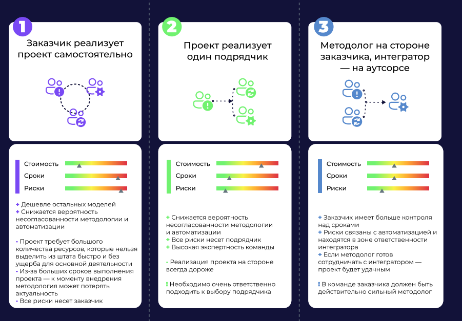 - Как взаимодействовать с методологами и интеграторами при реализации ИТ-проекта? Подводные камни и преимущества разных схем работы.
