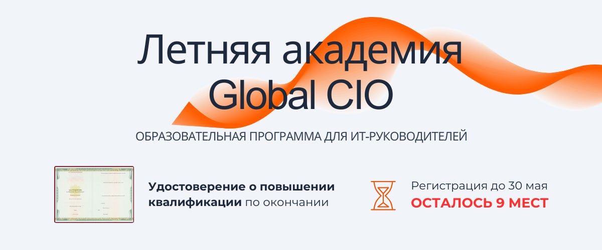 | Успейте попасть в Летнюю академию Global CIO — интенсив для ИТ-руководителей. Регистрация до 30 мая! | | | Летняя Академия — это интенсивная программа для ИТ-руководителей, созданная профессиональным сообществом лидеров цифровой трансформации Global CIO. В Академии вы улучшите навыки управления, расширите профессиональные связи и получите импульс для профессионального роста!- Занятия с 3 июня по 14 августа