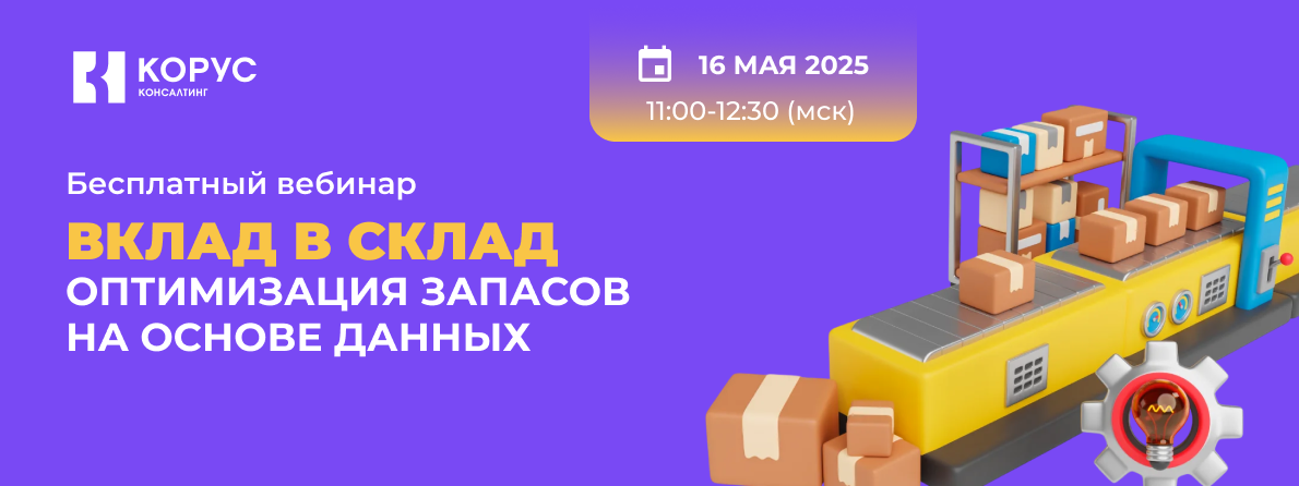| [Бесплатный вебинар] «Вклад в склад: оптимизация запасов на базе данных», 16.05.2025 | | | | Вебинар «КОРУС Консалтинг» 16 мая 2025 в 11:00 (мск) Излишки на складе замораживают оборотный капитал, что приводит к неликвидам и списаниям. Недостаток товаров срывает исполнение обязательств, результат - потеря клиентов и падение продаж.