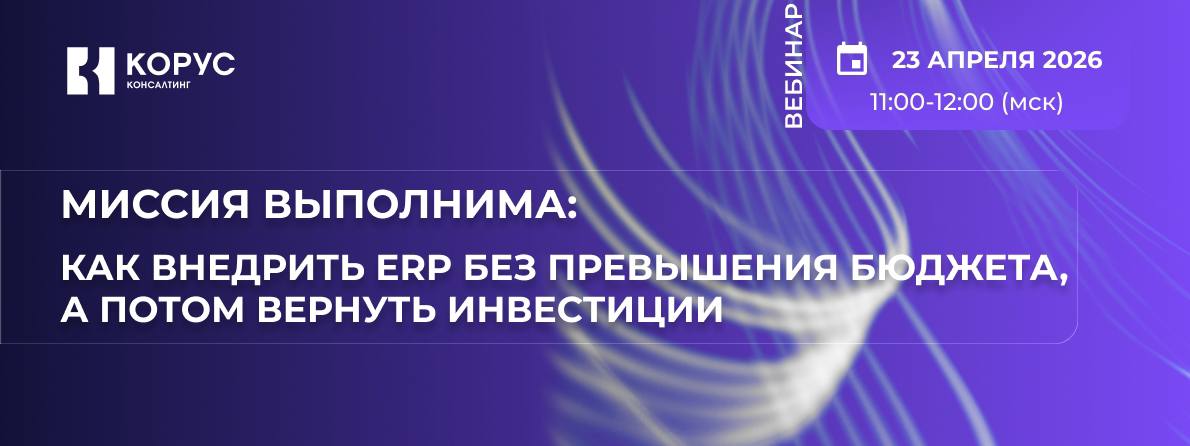 | Приглашаем на вебинар «КОРУС Консалтинг» — 23.04 в 11:00 | | | Вебинар «КОРУС Консалтинг» 23 апреля в 11:00 (мск)Расскажем о методологии проектирования сквозныхбизнес-процессов, которая гарантирует: - Вовлеченность бизнеса в ERP-проект,